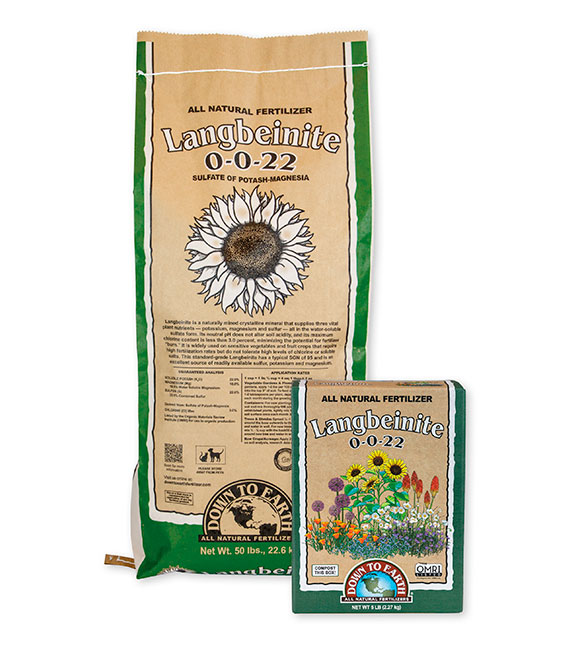 Down To Earth’s Langbeinite is a naturally mined crystalline mineral that supplies three vital plant nutrients — potassium, magnesium and sulfur — all in the water-soluble sulfate form. Its neutral pH does not alter soil acidity and its maximum chlorine content is less than 3.0 percent, minimizing the potential for fertilizer “burn.” It is widely used on sensitive vegetables and fruit crops that require high fertilization rates but do not tolerate high levels of chlorine or soluble salts. This standard-grade Langbeinite has a typical SGN of 95 and is an excellent source of readily available potassium, magnesium and sulfur.